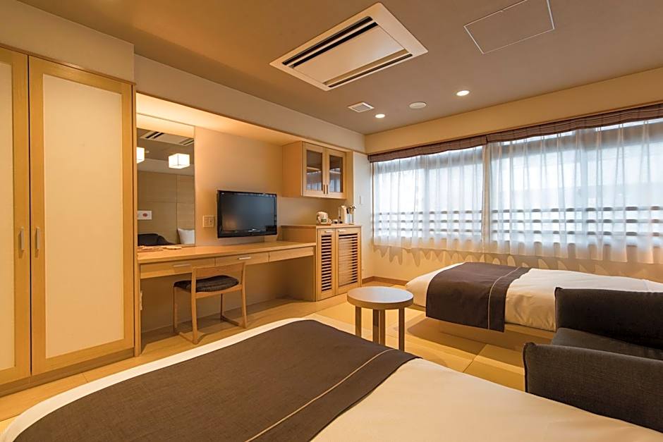 The spacious quadruple room provides air conditioning, a tea and coffee maker, as well as a private bathroom featuring a bath and a shower. The quadruple room features a wardrobe, a safe deposit box, a sofa, yukata and a flat-screen TV. The unit offers 2 beds and 2 futons.